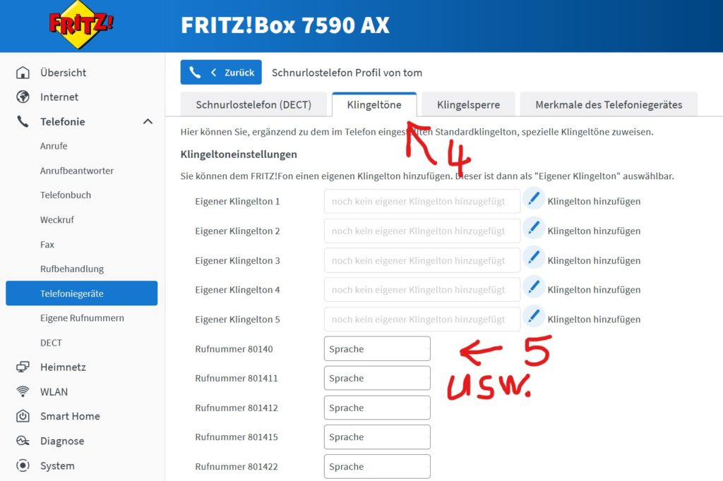 Dann die Rufnummer auswählen mit dem gwünschten KLINGELTON = Sprache (rote 5)